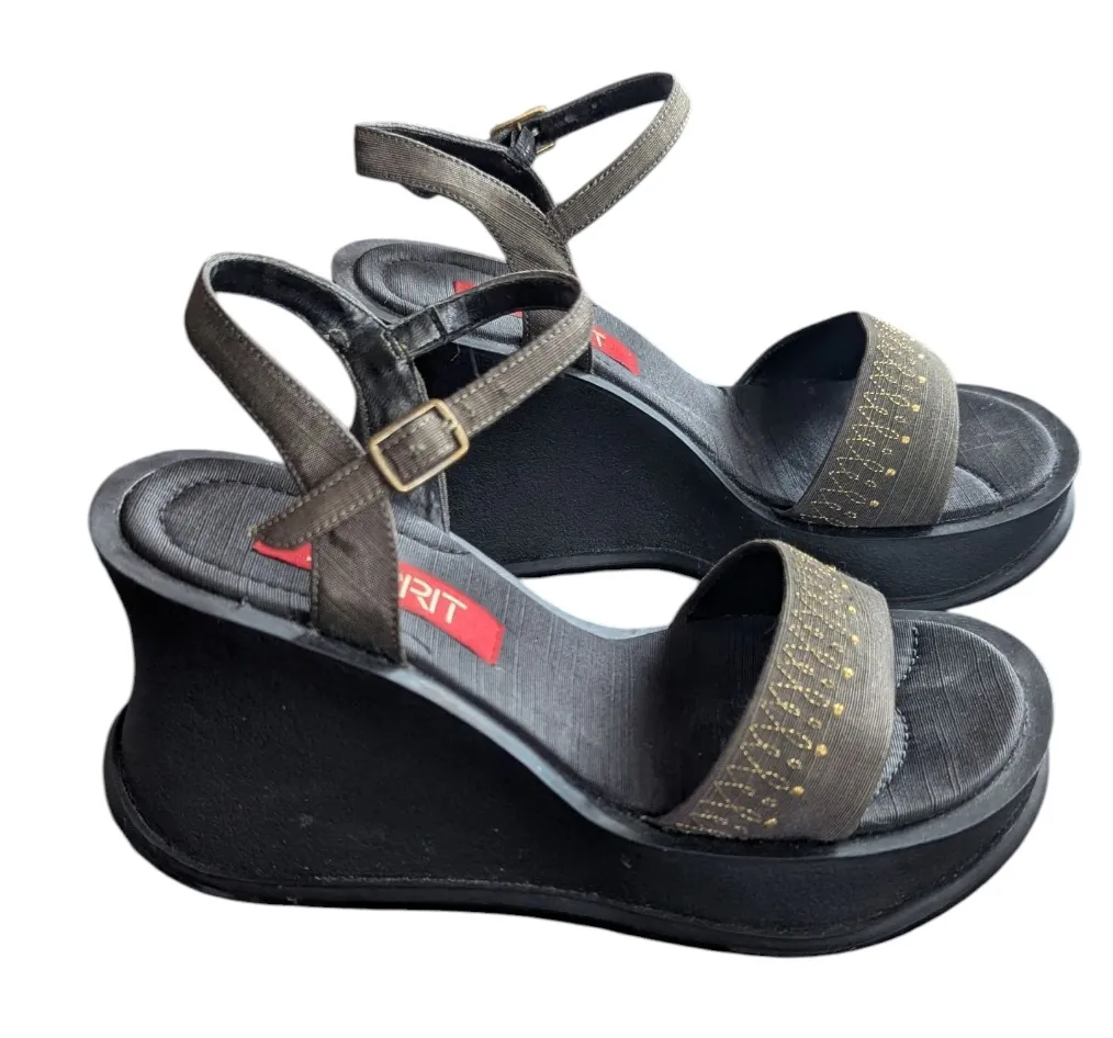 Size 6 Vintage Y2K Esprit Platform Chunky Wedge Sandals Step back into the early 2000s with these iconic vintage Esprit platform sandals. This is the quintessential chunky style that defined the era. They'd looks super cute with ruffled socks. Features a bold, architectural black platform and wedge heel, perfect for embracing the 90s / 00s aesthetic. The olive green fabric upper is adorned with charming gold embroidered/beaded accents. In excellent condition. Minor signs of wear on the soles consistent with a vintage item. Y2K, Vintage, 90s, 2000s, Retro, Platform, Wedge, Sandals, Chunky, Esprit, Embroidered, Olive Green, Brown, Gold, Ankle Strap, Open Toe, Grunge, Goth, Streetwear, Boho, Festival, Rave, Coastal Grandma, Bratz, Casual, Vacation, Heels