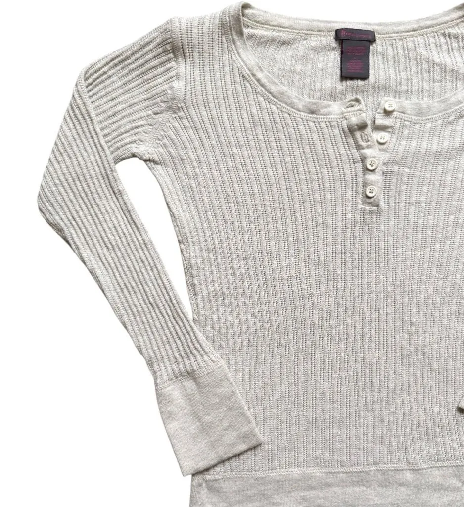 Vintage Y2K Fire Los Angeles ribbed knit henley top in a soft cream / oatmeal tone. This piece has a flattering, fitted silhouette with classic early-2000s minimal styling that layers perfectly or stands on its own. Features a scoop neckline with a partial button henley placket, long sleeves with extended cuffs, and a ribbed knit texture throughout. Lightweight and stretchy with a comfortable everyday feel. Vintage Y2K / early 2000s era Fire Los Angeles brand Cream / oatmeal neutral color Ribbed knit texture Scoop neck with button henley front Long sleeves with wide cuffs Fitted silhouette Pullover style Size: Large vintage y2k top, fire Los Angeles shirt, y2k henley top, ribbed knit top, vintage cream sweater, y2k minimalist top, 2000s fashion, long sleeve henley, fitted ribbed top, neutral knit top, womens vintage shirt, casual y2k top, layering top vintage