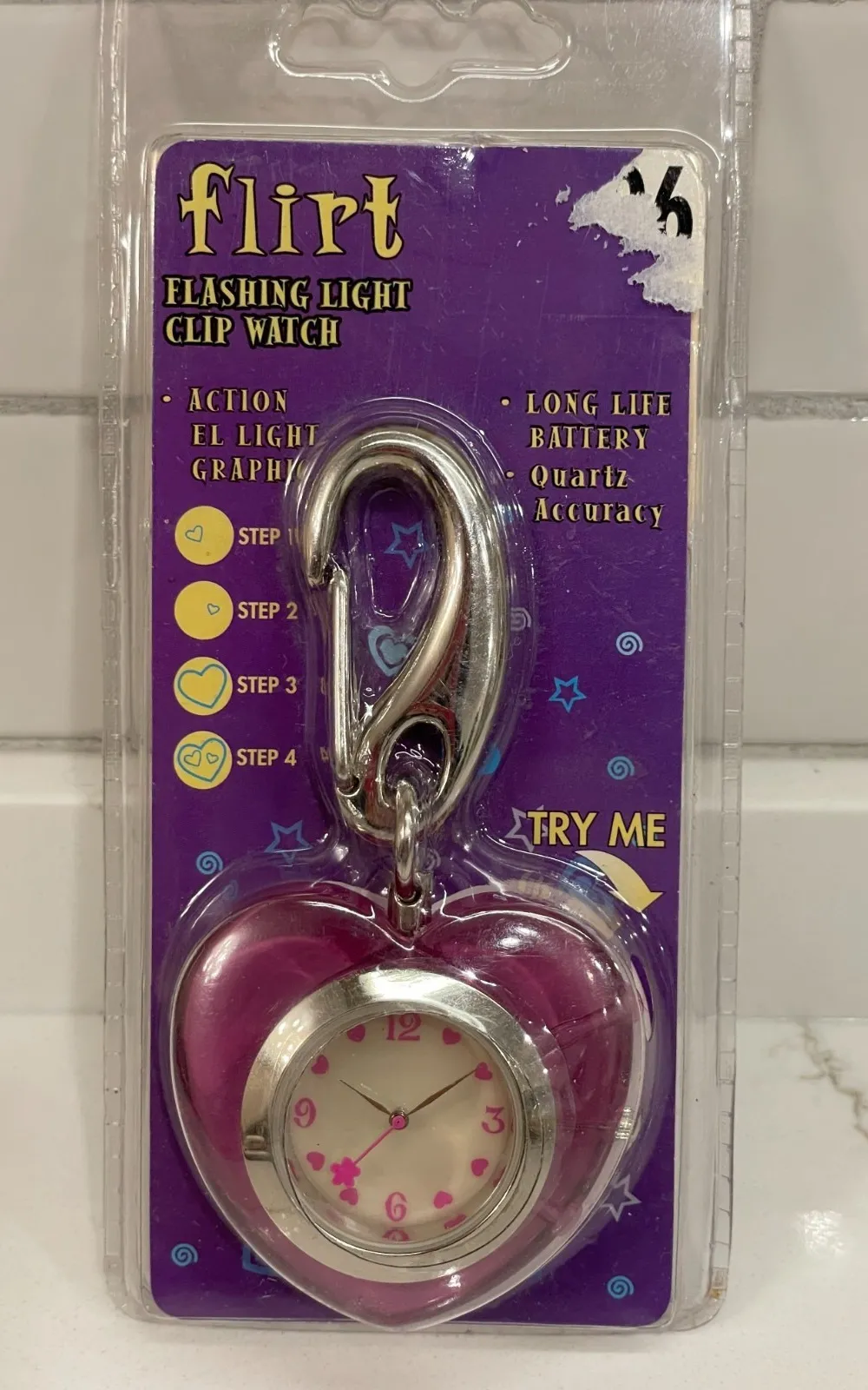 Vintage Y2K Flirt Flashing Light Clip Watch. Heart shape in Pink & Silvertone. Charm style. Sold at Walmart. Sealed in package. lights work. New in sealed package. tags: y2k, heart, vintage