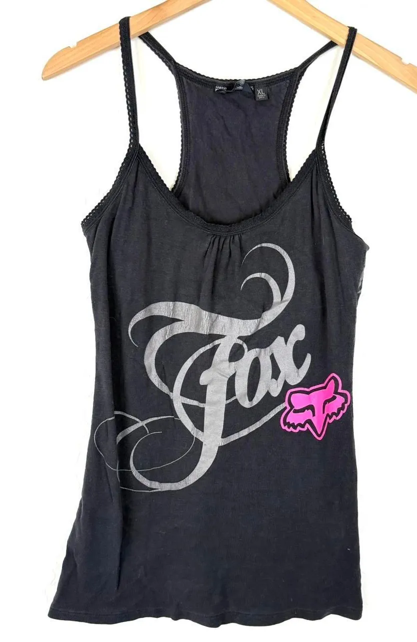Vintage Y2K Fox Racing black tank top with grey and pink graphics double sided graphics and logos. Size XL, a little bit of cracking in the logos but overall good condition. Lace trim. P2P- 16” across Length- 28” #grunge #y2k #foxracing #skater