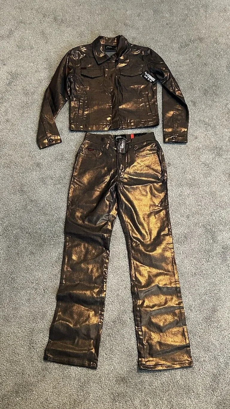 Get ready to strut your stuff in this striking Vintage Y2K FUBU Metallic Brown Pants and Matching Ja... Show more