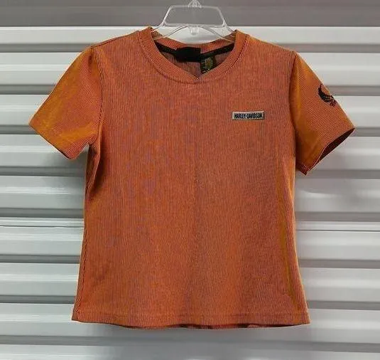 Vintage Y2K Harley-Davidson Women's Size Medium Short Sleeve Orange Ribbed Crew Neck Pullover Top Sweater T-Shirt. Bikercore, Bike riding gear, Moto, Grunge, Punk Good Pre-owned Condition. Orange/Black Striped Ribbed. Short Sleeve. Bust pit to pit 18.5". Length is approximately 22". B131 020725