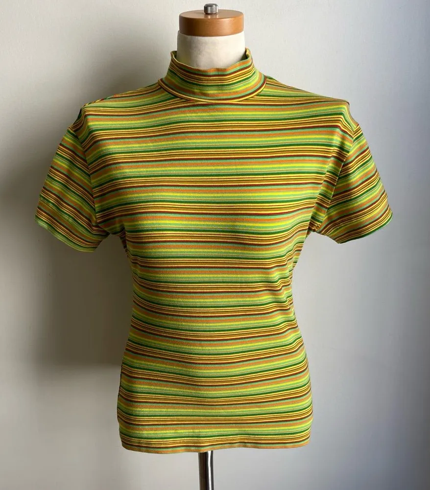 Fun vintage Y2K Henri Bendel mock neck striped stretch top, size Medium. Materials and size tag is too faded to read. Piece is a medium based on measurements: 18" shoulder to shoulder laid flat, 18" armpit to armpit laid flat, 23" top of shoulder to bottom hem. Fabric is likely a cotton/spandex jersey as it is stretchy. As with all Henri Bendel pieces, this top is very well made. Colors are various greens, yellow, blues, and red. In Excellent condition with no noted flaws and little to no signs of wear.