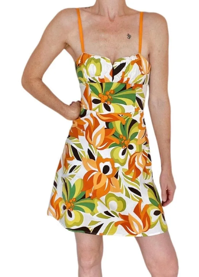 •Measurements>>> Pit to Pit: 13 3/4” Waist: 23 1/2” Dress Length (From Shoulder:) 31 1/2” (Approximately, shoulder straps are adjustable.) ***Measured flat, dress does have some stretch. •Dress is tagged as size 1/2. •Model Reference: 5’6” 113lbs (25” Waist) Bust: 30B •Brand: Jodi Kristopher •Fabric: 97% Cotton, 3% Spandex Lining: 100% Polyester •Clean and in good condition. Used item, normal wear. Dress has multiple flaws, marks on fabric, small hole, and lining is cut underneath, (See last 2 photos.) Price reflects flaws. •Comes from a smoke/pet FREE home. ***PLEASE: read full description, and look at all photos before purchasing. •Dress closes with a zipper, in the back. See description.