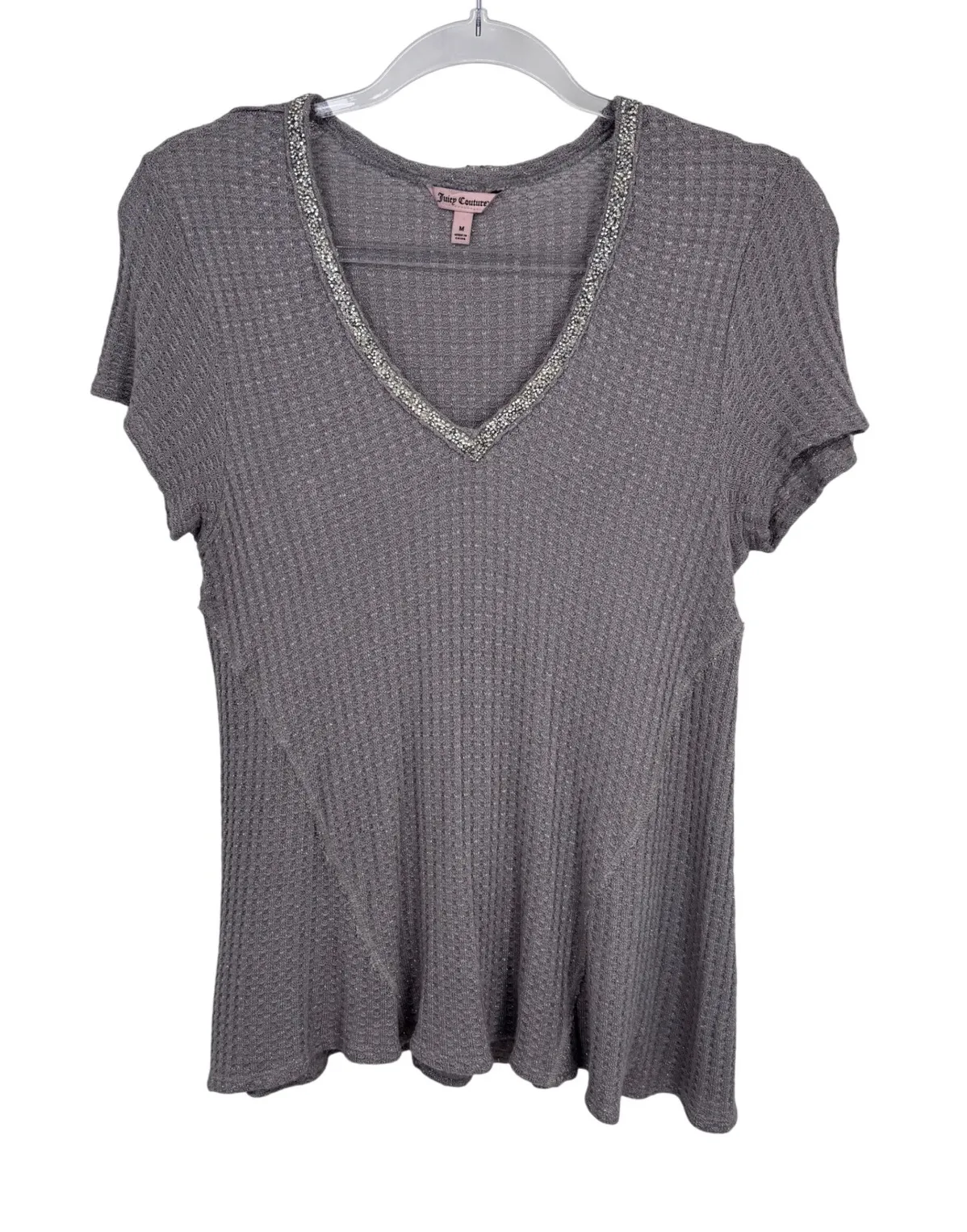 Keywords: Juicy Couture, gray top, waffle knit, embellished, rhinestone, V neck, short sleeve, t shirt, casual top, sparkle, A line, medium, womens top