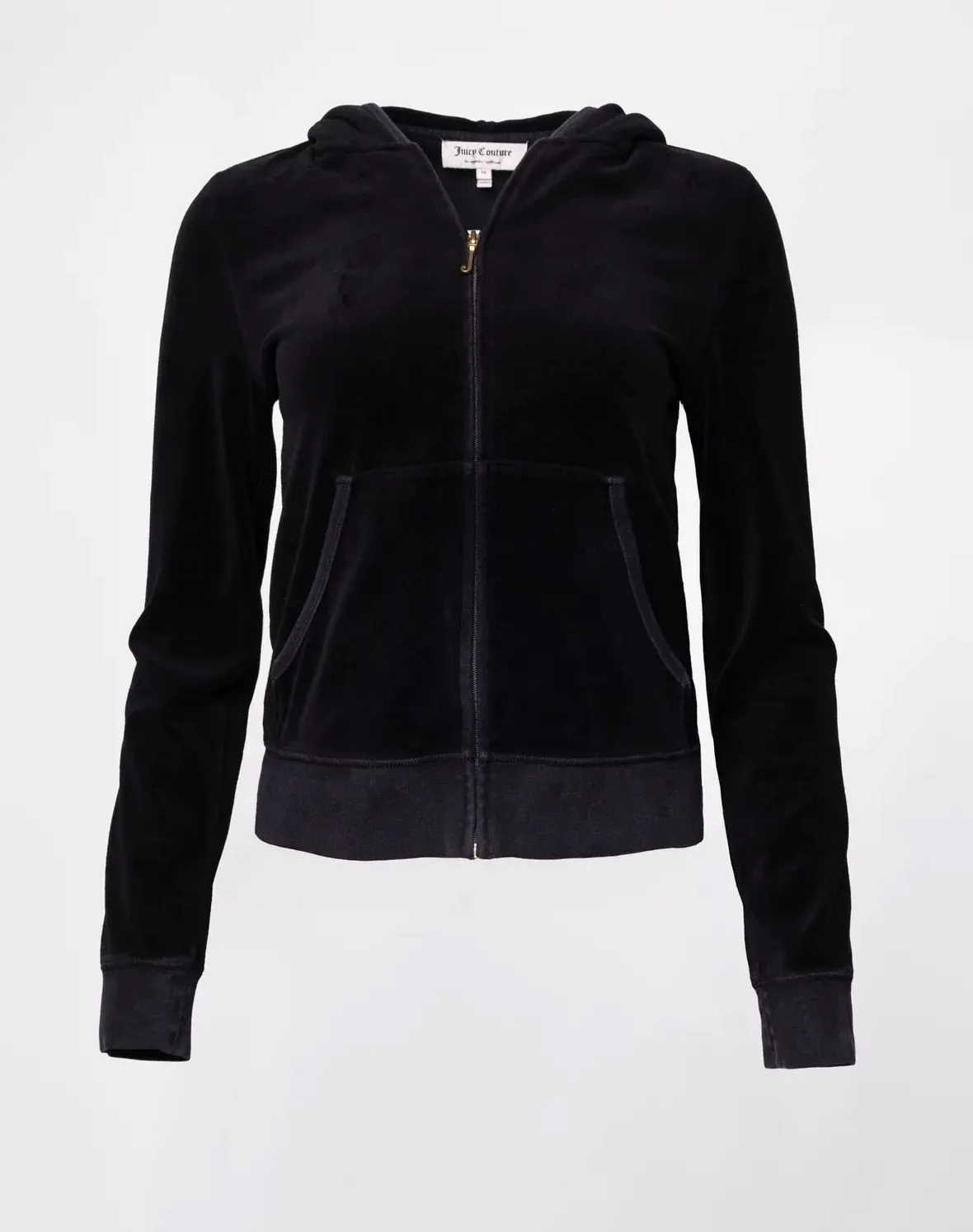 - Y2K Made in the U.S.A Black Velour Zip Up Hoodie with a slim fit, branded zipper, pouch pockets, & rib jersey cuffs & hem