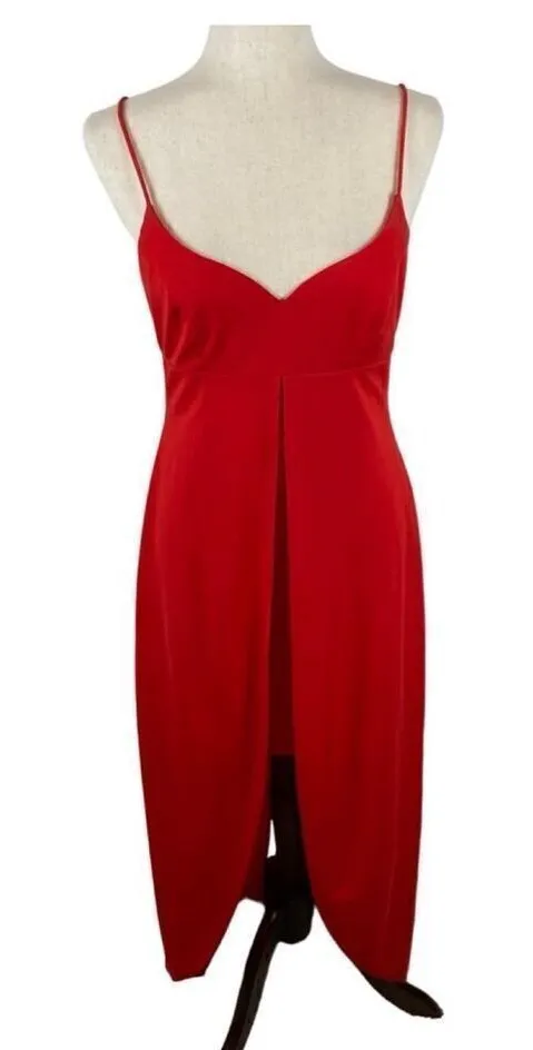 Vintage Y2K NIKI by Niki Livas Red Tulip Dress Womens Hi-low Spaghetti Strap Size S-mannequin is size 6/8 for reference Good used condition-Seam on back is starting to come undone-see photos  This cool retro dress has non adjustable spaghetti straps, sweetheart V-neck, rounded back,tulip skirt over short internal skirt with back slit  bust 30 waist 29 hips 38 length 50/57