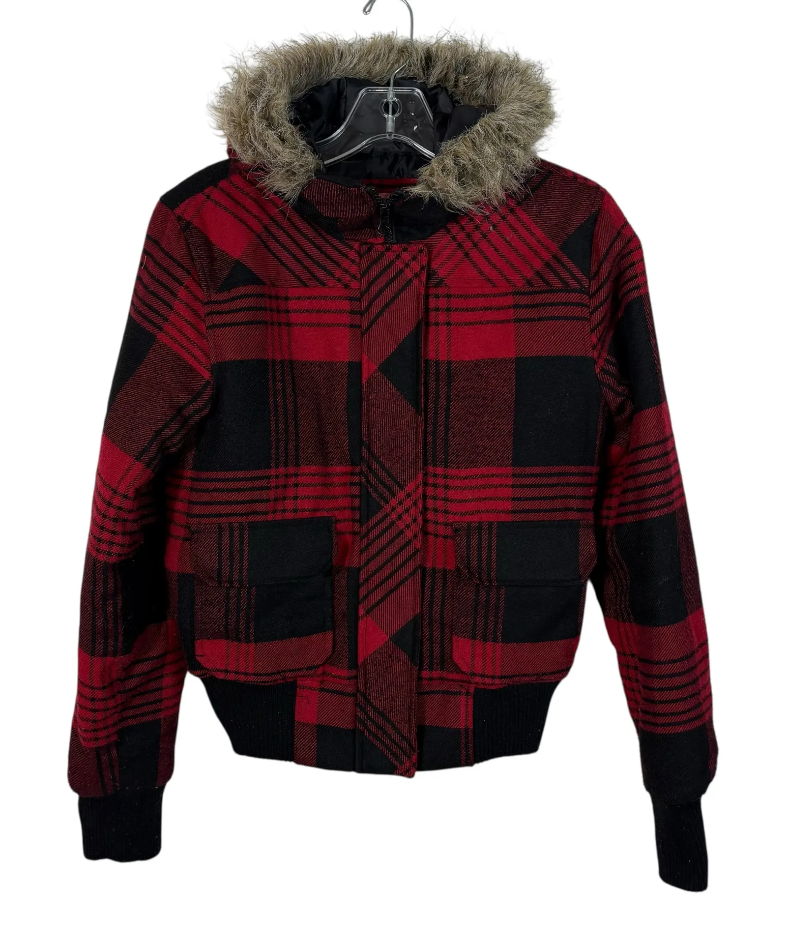 In good condition! Black and red plaid design with a cute brown fur hood. Slightly shorter length - very Y2K. Patch pockets on the front. Full zip. Has some general wash wear. Gently used. No rips, stains, or holes! Size small. Pit to Pit: 18in Shoulder to Hem: 21in Some wash wear