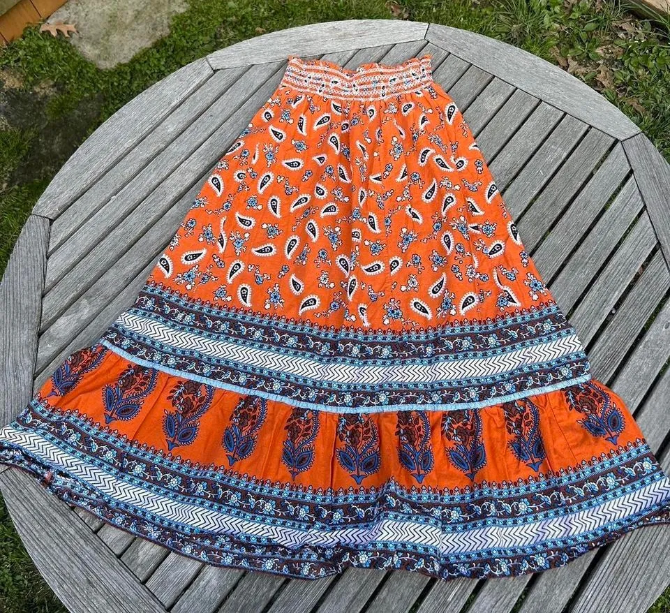 Vintage Y2K, orange fairy skirt by planet gold size medium. preowned great condition. Orange, blue, brown, and white designs of paisley and florals. Elastic around waist, lots of stretch. 100% cotton. 12 in waist, 36 in hem. Ships in 1-3 days 💅