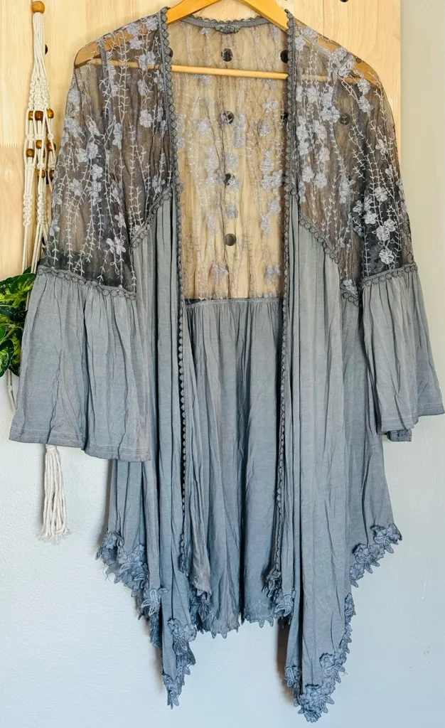 Elegant gray kimono with lace detailing and long sleeves. Perfect for special occasions or casual ou... Show more