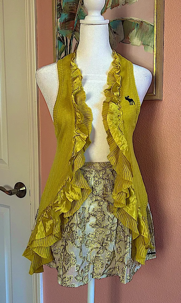 Vintage new with tags. #deadstock The vest is a sleeveless, bright yellow, ruffled cardigan-style... Show more