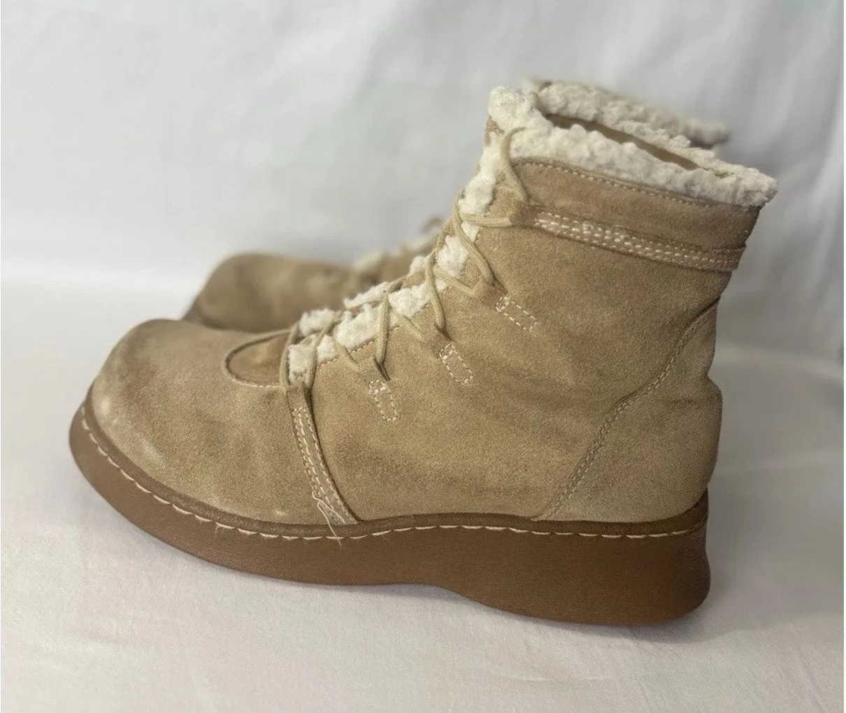 Vintage Y2K Report platform boots for women, size 8.5, in tan suede leather with faux shearling lining. Stylish and comfortable platform design, perfect for retro fashion lovers. Please note: one lace is damaged.