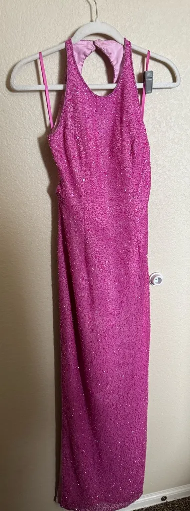 in excellent used condition fully beaded size XS fits true to size Pit to Pit: 15.5” waist: 12” overall length: 50” pink y2k silk sequin beaded style prom, homecoming, formal, occasion