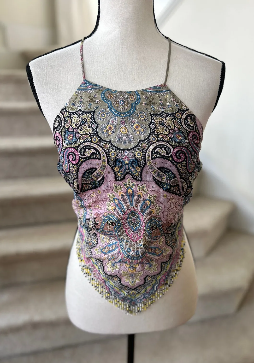 Excellent condition. Vintage Y2k era lavender purple, black and blue paisley print. Backless, ties in back, halter scarf style with beaded fringe trim. Size 6 pit to pit 18.5 inches neck to hem 18 inches Silk boho, whimsygoth, practical magic