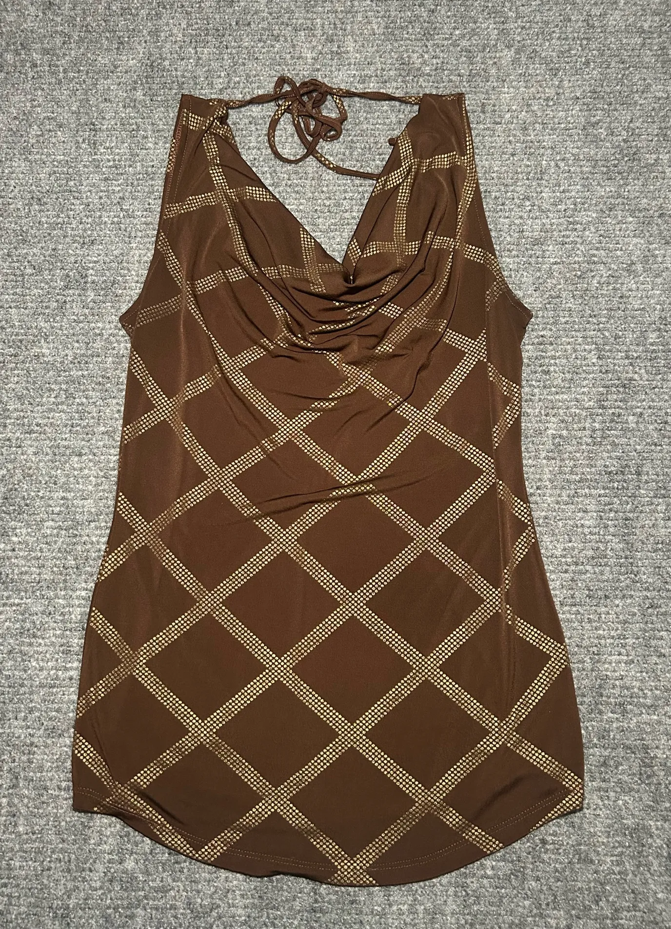 The product is a vintage Y2K Southpole Collection ladies sleeveless top in a brown/gold color, size... Show more