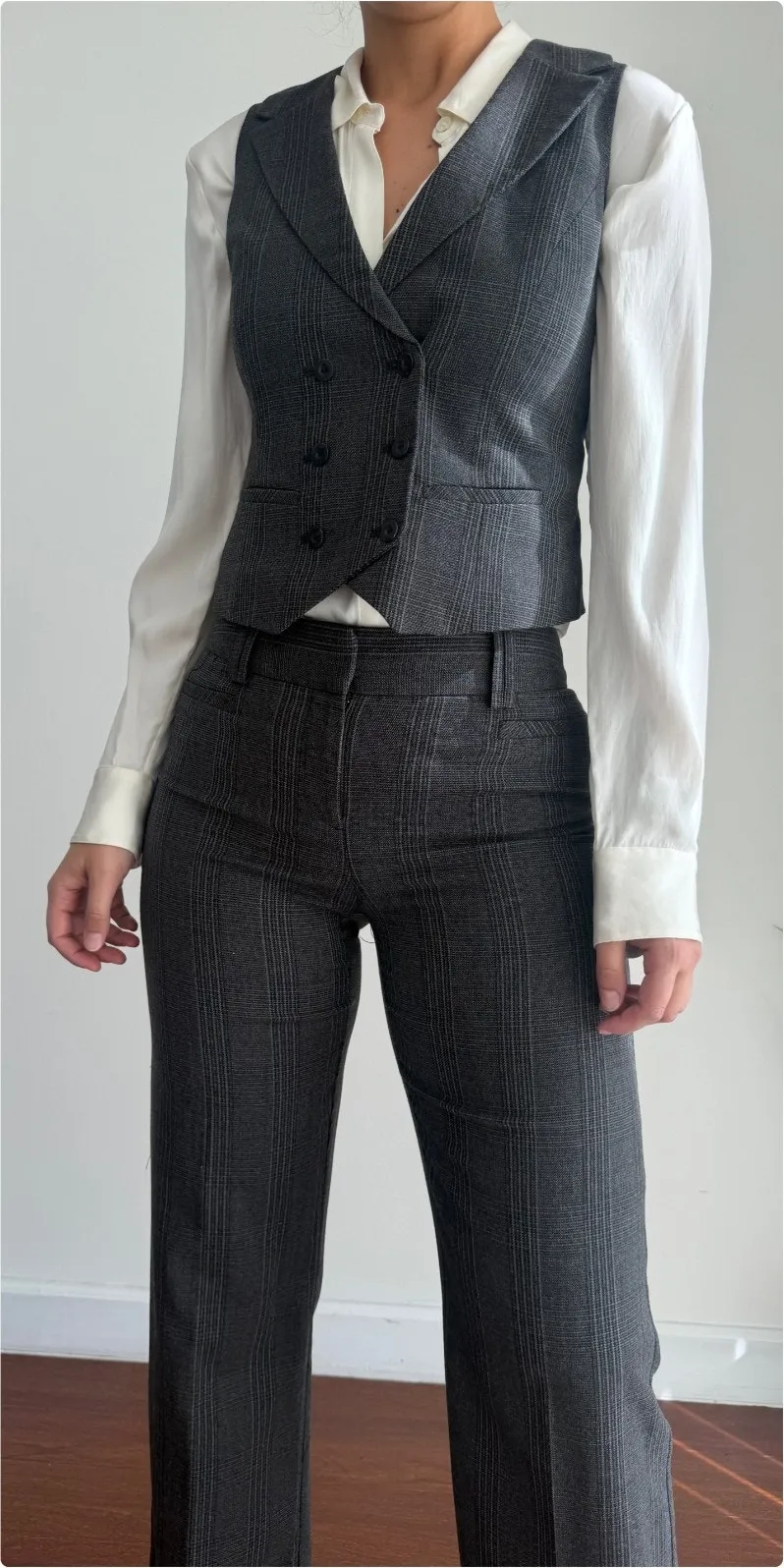 Vintage two-piece suit set featuring a tailored waistcoat vest and matching trousers in a charcoal plaid suiting fabric. The structured silhouette and menswear-inspired design give this set a sharp, early-2000s feel while remaining timeless and easy to style. KEY DETAILS * Two-piece set: vest / waistcoat + trousers * Color: charcoal gray * Pattern: plaid * Tailored, structured fit * Classic menswear-inspired design * Early 2000s / Y2K aesthetic * Can be worn together or styled separately ---------------------------------------- SIZE & FIT * Tagged size: Women’s XS ( VEST ) and size 2R ( PANTS) * Please refer to measurements for best fit * Measurements (laid flat): * Vest pit to pit 16.5'' * Vest length: 18.5'' * Trouser waist: 14'' * Rise: 9'' * Inseam: 31''