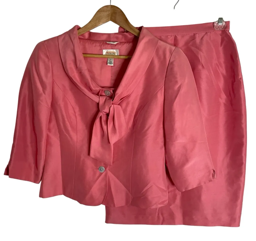 Chic Talbots silk piece in vibrant pink. Smooth texture and refined look. Blazer has tie at neck and... Show more
