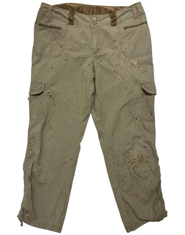 Level up your Y2K streetwear game with these Vintage Venezia cargo pants featuring all-over splatter paint details and bold tribal graphic accents. These tan cargos bring back early 2000s attitude with a roomy fit, edgy design, and utilitarian vibe. • Size: 20 (Women’s) • Waist (flat lay): 38” • Rise: 11” • Inseam: 30” • Material: 97% cotton, 3% Lycra Spandex • Button + zip fly closure • Functional cargo pockets • Stretchy and comfortable with a structured streetwear silhouette A true throwback essential for fans of Y2K, skater, grunge, and urban aesthetics. Pair with a crop top, baby tee, or oversized hoodie for that authentic vintage street style look. Hashtags: #Y2KFashion #VintageVenezia #CargoPants #StreetwearStyle #TribalGraphic #SplatterPaint #Early2000sLook #GrungeVibes #Y2KStreetwear #CurvyStreetStyle
