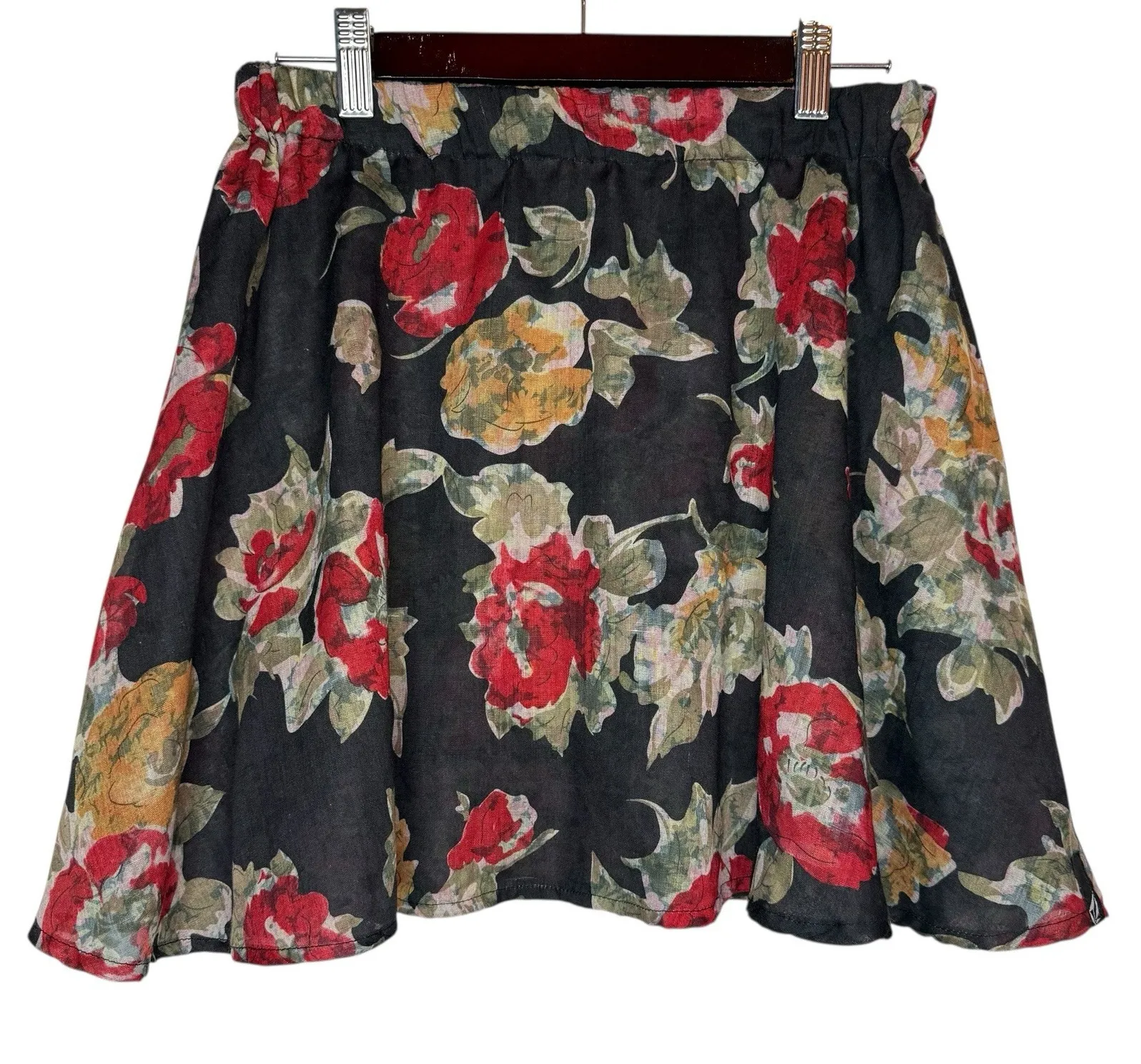 Rare vintage Y2K Volcom "Two Faced" block combo ruffle skirt in size Small. Made in the USA, this reversible-style piece features a unique double-sided floral design — one side with bold red and gold roses on black, and the reverse showcasing soft pink and purple florals for a romantic contrast. Lightweight woven fabric with flowy movement, a comfy elastic waistband, and a flirty ruffled hem give it that effortlessly cool early-2000s skater-meets-boho vibe.