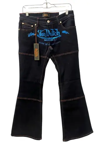 Brand new with tags and never been worn from early 2000's! Rare item! Made In Italy Measurements: Waist: 28" Rise: 8" Inseam: 31" Materials: Cotton, Elastane Made In Italy These are a pair of women's Von Dutch flare jeans in a dark blue wash with contrasting orange stitching. The front features a blue "Von Dutch Originals" logo print with a motorcycle graphic. The jeans have a button and zipper closure, with "Von Dutch" embossed on the button. Visible tags indicate a size of W28 L30 and the model "TH549 THROWBACK". The back of the jeans includes a brown "Von Dutch Paris" patch on the waistband. The flare design starts below the knee, and the jeans appear to be in new condition with tags attached. Tags: motorcycle, y2k, 2000s, von dutch, biker, rave, festival, concert, casual, spring, summer, fall, winter, coachella, event, everyday, cotton, metallic, logo, blue, orange, low rise, funky, moto, streetwear