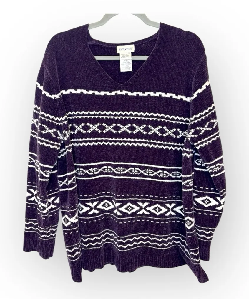 Cozy up in this retro White Stag sweater featuring a classic Fair Isle-inspired geometric knit in rich sugared plum purple with white accents. Perfectly oversized and soft, this piece channels 90s/Y2K vibes while keeping you warm all season. • Size: Women’s XL (16/18) • Pit to Pit: 24” • Length: 28.5” • Material: 100% Acrylic • Color: Sugared Plum with White pattern • Condition: Pre-owned, excellent condition A timeless vintage-inspired sweater for layering with jeans, leggings, or even over dresses. Ships from a smoke-free, pet-friendly home.