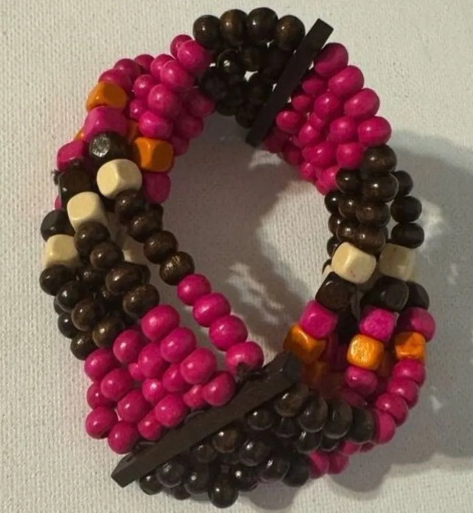 Vintage Y2K Womens Chunky Pink Brown Layered Beaded Cuff Bracelet Boho Western Great Preowned Condition!! Bundle and Save!! 90's Y2K Preppy Boho Western Retro Reggae Island Vacation Beach Indie Colorful Bohemian Casual Fun