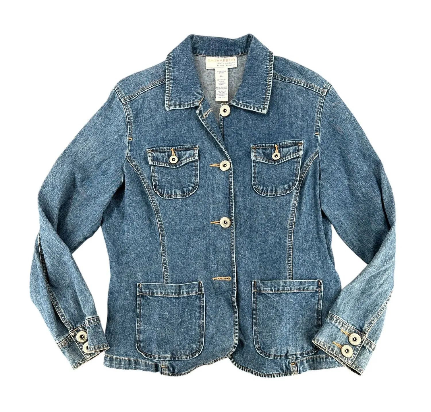 arge Tappered at waist, double buttons on sleeve - collared long sleeve pockets - flattering figure women's large petite 99% cotton 1 % spandex light stretch Chest 36 - 37 in Length 22 in Excellent condition Western casual coastal Retro Y2K true vintage women's classic