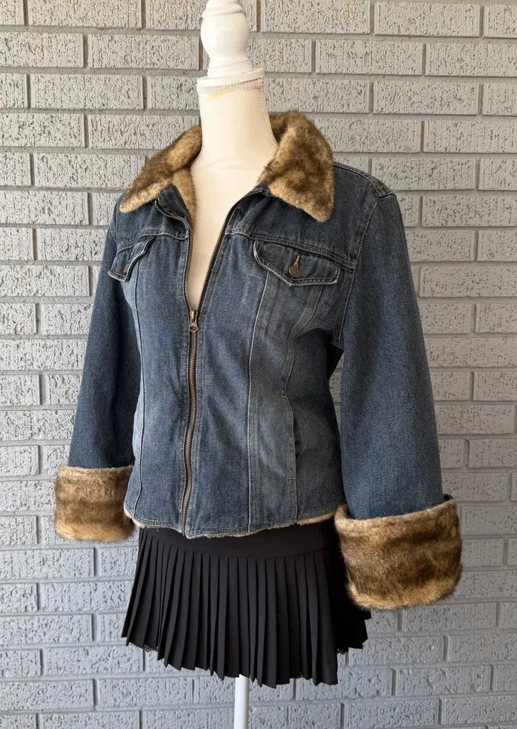 Vintage Y2K Women’s Giacca denim jacket w/ fur trim Size Large Bratz Winter Jean Blue - $115 - From Jazmin
