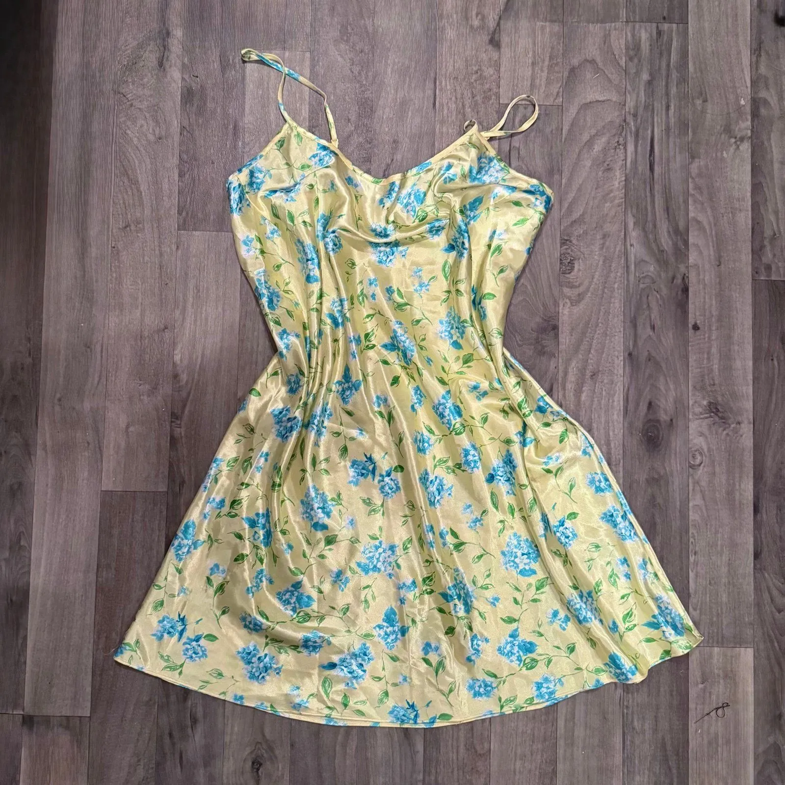 Vintage yellow and blue floral coquette satin slip dress Size L - $42 - From Blue