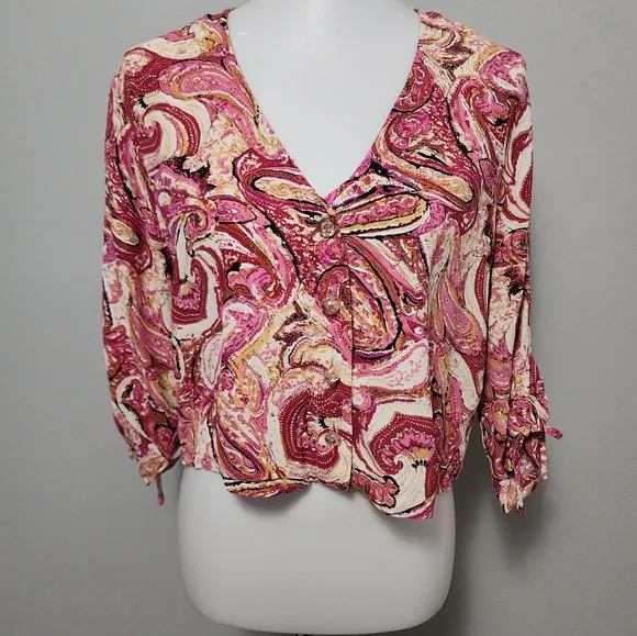 Vintage Zoe California 90s Pink Paisley Tie ¾ Sleeve Cropped Top Size Small The Zoe California Pink... Show more