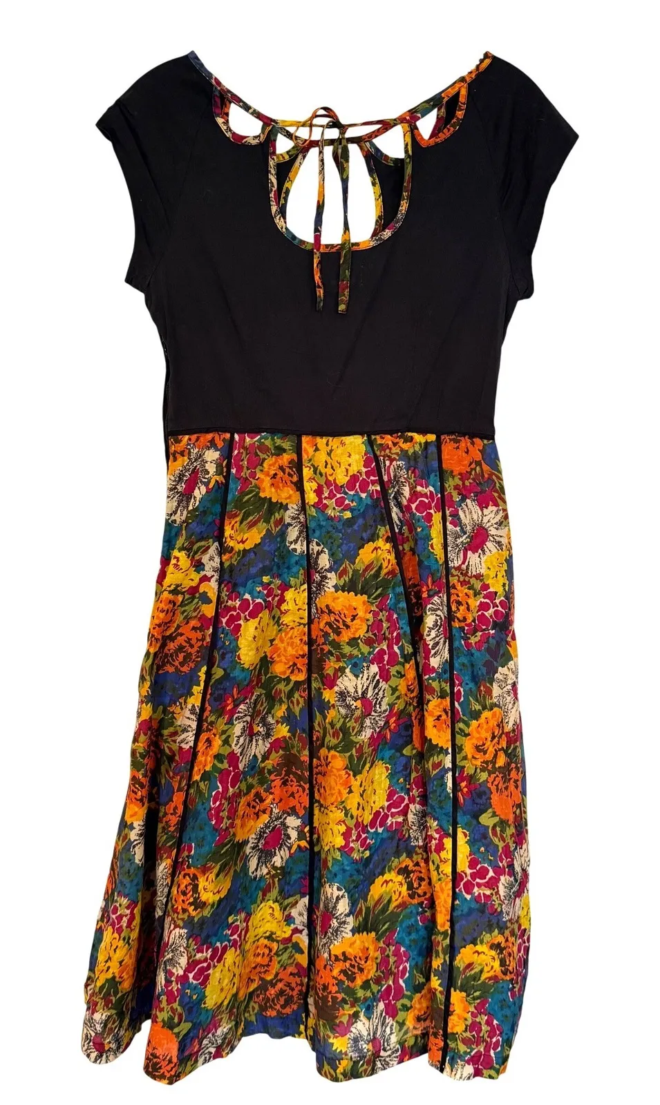 . Discover a captivating blend of elegance and whimsy with this Viola fit and flare dress. The striking floral print bursts with vibrant hues of orange yellow blue and pink across the skirt creating a playful contrast with the sophisticated black bodice. A charming keyhole neckline adorned with a colorful print trim and tie closure adds a unique feminine touch. The flattering fit and flare silhouette accentuates your figure beautifully making it perfect for garden parties brunches or a stylish day out. Measurements: • Shoulder to Hem: 36 in Style: A-Line, Fit & Flare, Sundress Dress Length: Midi Department: Women Sleeve Length: Short Sleeve Pattern: Floral Occasion: Casual, Party/Cocktail Material: Cotton, Silk, Lyrca Fabric Type: Woven Theme: Flower Neckline: Round Neck Season: Spring, Summer Sleeve Type: Cap Sleeve Closure: Tie Keywords: Viola dress, floral dress, fit and flare, keyhole neck, tie neck, cap sleeve, summer dress, spring dress, garden party, brunch outfit, feminine, colorful print, retro, vintage inspired