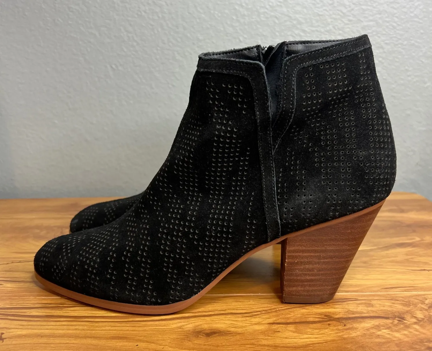 Violet & Red Jensen ankle boots in black suede. These stylish boots feature a perforated pattern across the entire shoe and a stacked wooden block heel. A side zipper ensures easy on and off. Perfect for a night out or adding a chic touch to a casual daytime look. Condition: NEW without box/tags, no flaws Style: Bootie Department: Women Upper Material: Suede UK Shoe Size: 8.5 AU Shoe Size: 8 Shoe Shaft Style: Ankle Lining Material: Fabric Insole Material: Leather Outsole Material: Rubber Heel Style: Block Heel Height: Mid (2-2.9 in) Occasion: Casual, Party/Cocktail, Workwear Toe Shape: Almond Toe EU Shoe Size: 40 Keywords: black boots, suede boots, perforated, block heel, ankle boots, side zip, chunky heel, western inspired, cowgirl chic, fashion boots, fall fashion, winter boots, dressy casual, statement boots We ship fast! Usually same or next day.