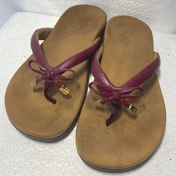 Like new condition Adorned with a feminine bow that’s trimmed with the Vionic “V” logo, this toe-post style is the perfect sandal to slip on this spring. Manmade upper with microfiber-covered footbed. Lightweight, flexible EVA midsole absorbs shock, reducing stress on feet, ankles, and knees. Durable rubber outsole with a patterned tread provides traction on a variety of surfaces. Vionic Technology is biomechanically designed to hug your arches and support your feet in comfort. Vionic sandals' built-in orthotic is shown to be effective in helping to treat heel pain (plantar fasciitis).* Received APMA Seal of Acceptance
