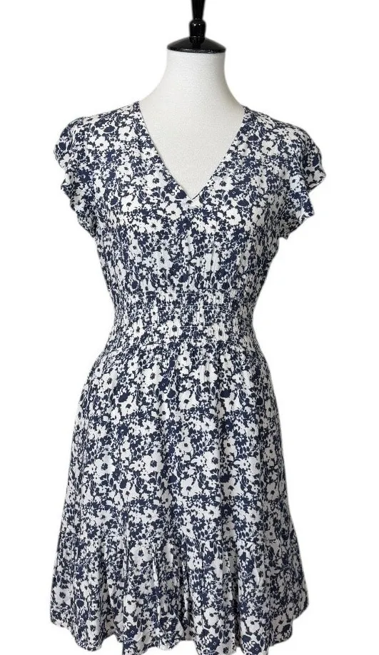 Rails Tara Navy White Textured Floral Dress Women’s Size XS Style Details • Tara mini dress • Navy and white floral print • Soft V neckline • Flutter cap sleeves • Smocked elastic waist • Lightweight woven fabric • Tiered skirt with subtle ruffle hem • Pull over style • Feminine, flowy silhouette • Excellent preowned condition Fit Details • Women’s Size XS • Approximate flat lay measurements: – Across underarms: 17” – Across waist: 14” (stretches) – Length: 34” from shoulder to hem Fabric & Care • Rayon & Viscose blend • Machine wash cold Style Tags feminine casual chic boho romantic spring summer brunch vacation day dress resort short mini flowy pretty wedding guest vacation beach cruise cruisewear