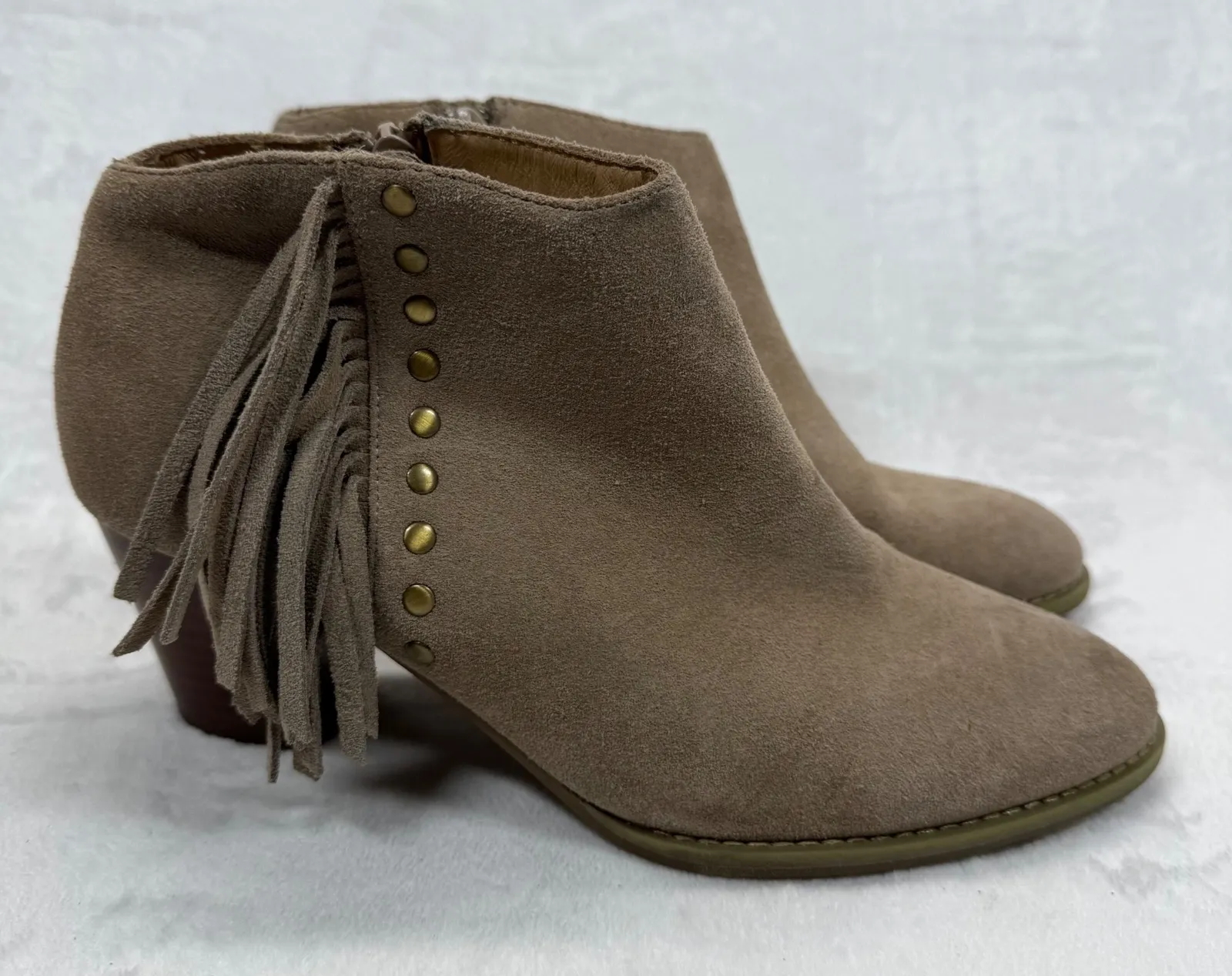 Style: Bootie Color: Brown Department: Women Upper Material: Suede UK Shoe Size: 7 Shoe Shaft Style: Ankle Heel Style: Block Lining Material: Leather Insole Material: Leather Outsole Material: Rubber Occasion: Casual Toe Shape: Round Toe Heel Height: Mid (2-2.9 in) Type: Boot EU Shoe Size: 41 Model: Vionic Faros Keywords: Vionic, ankle booties, suede boots, fringe boots, western boots, taupe boots, brown booties, size 9, womens shoes, casual boots, fashion boots, comfortable boots, orthopedic boots, suede ankle boots