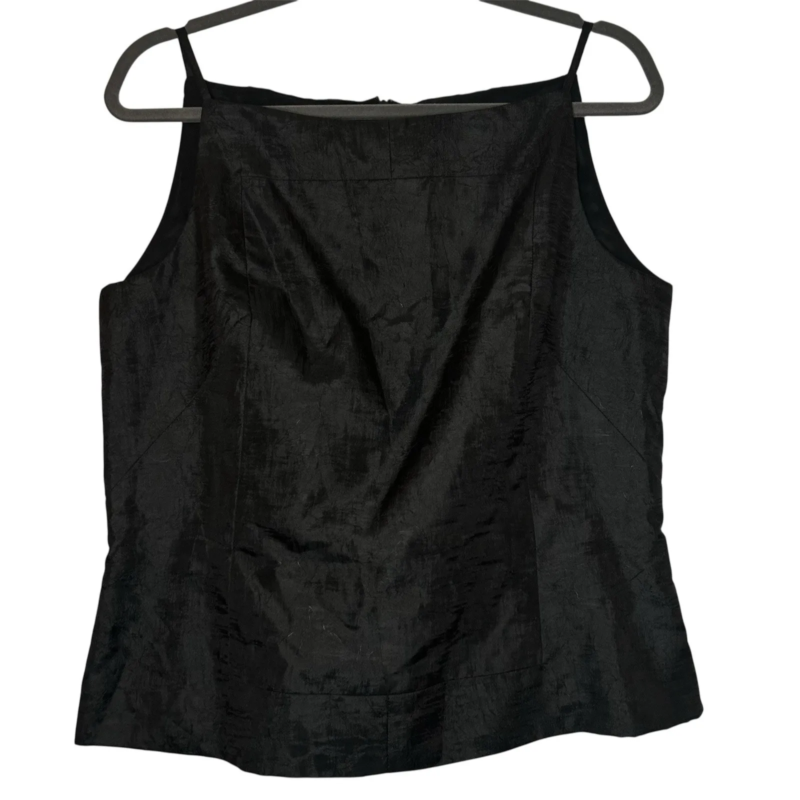 The Visage Royal Women's Size 14 Black Sleeveless Tank is a formal camisole made in the USA. It features a square neckline, zip closure, and is made of lightweight polyester satin fabric. The black color and sleek design make it perfect for formal occasions during the summer, fall, and spring seasons. The brand, Visage Royal, ensures quality and style for women looking for a sophisticated addition to their wardrobe. Perfect for adding a touch of elegance to any outfit, this tank is a versatile piece for any formal event. Pit to pit 19" Length 21" Bin N