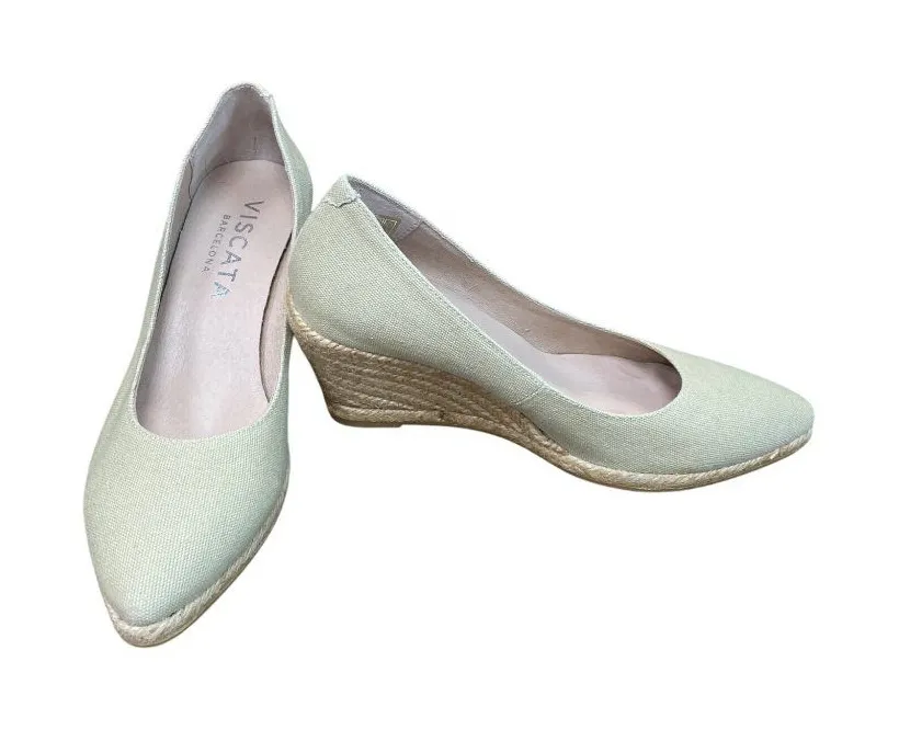 Elegant and versatile, these pistachio green Viscata espadrille wedge shoes offer a chic and comfortable option for both casual and semi-formal occasions. The neutral hue and classic design make them a tasteful addition to any wardrobe. Crafted with care, they reflect superior quality and style. In very good condition in and out with no defects noted. SKU 9242 • Espadrille wedge heel • Durable rubber outsole • Slip-on style • Pointed toe design • Lightweight construction Features: • casual formal wear • All Season • Spain Size: Womens Size 39/8 Condition: Pre-Owned Good No defects noted. Although we clean our items additional cleaning may be needed such as spot treatments, etc.