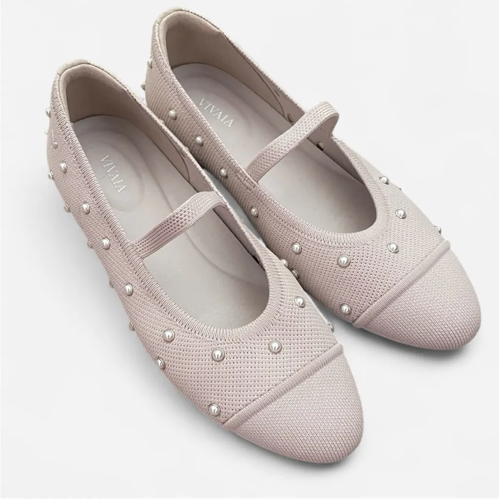 — Gently used, minor marks on bottoms Beige nude with a slight blush tone US 9 — Pearl embellishments Almond round cap toe Elastic strap across the foot Recycled knit — Ballet ballerina coquette Valentine’s Day work office career statement casual wedding bride Mary Jane’s winter spring boho pearls studded studs preppy academia rare unique formal