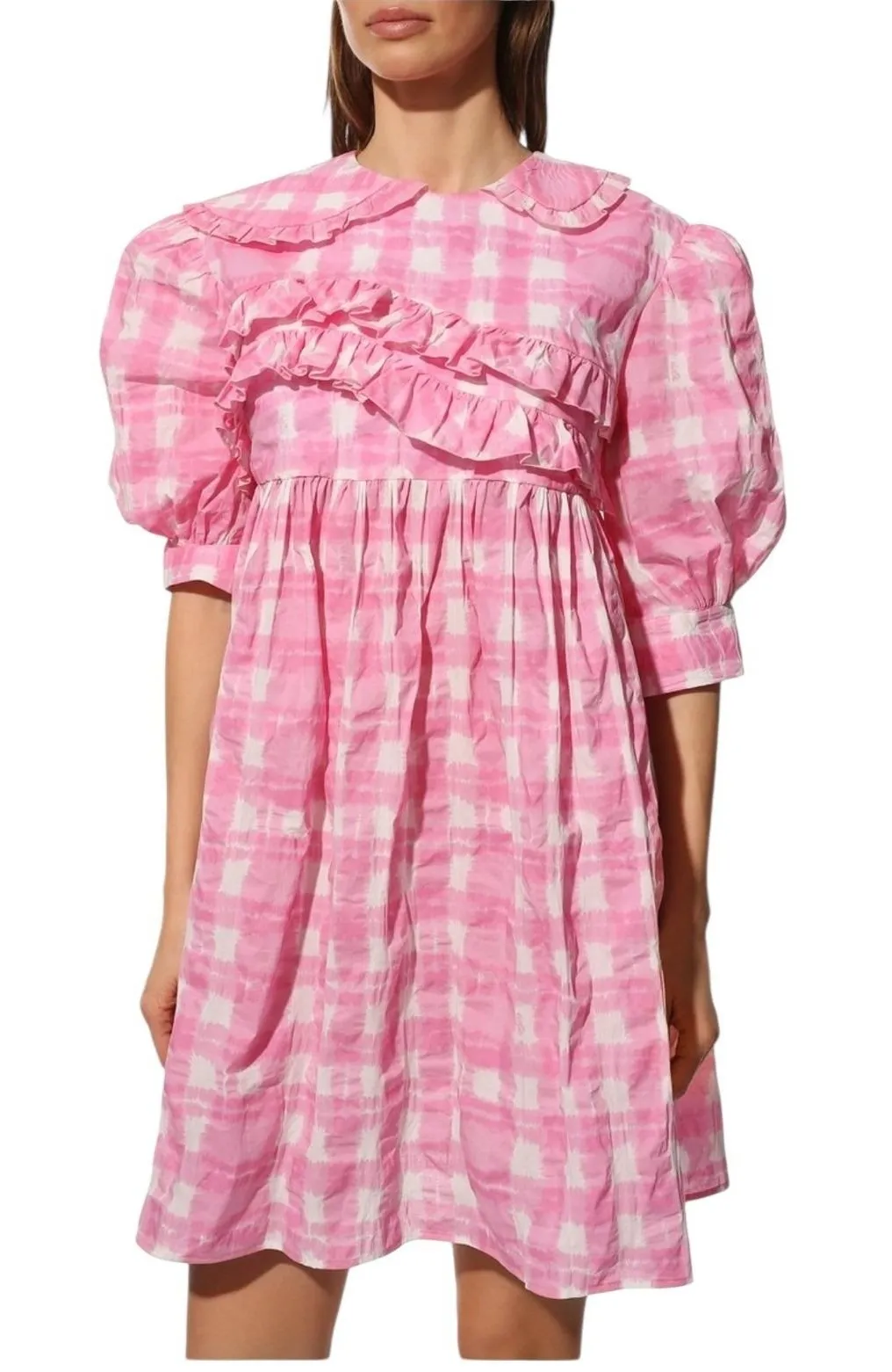 Pre-owned. No flaws. Smoke free home. Across chest 19.5'' Length 35'' Vivetta pink and white plaid mini dress with a charming ruffle collar and playful tiered ruffles down the bodice. The puff sleeves add a touch of vintage-inspired volume. Crafted in Italy, this dress offers a unique blend of whimsical style and sophisticated construction. Style: A-Line, Fit & Flare, Sundress Dress Length: Knee Length Department: Women Sleeve Length: Half Sleeve Pattern: Plaid Occasion: Casual, Party/Cocktail Material: Cotton, Polyester Blend Neckline: Collared Season: Spring, Summer Sleeve Type: Puff Sleeve Closure: Zip Accents: Ruffle Keywords: Vivetta dress, plaid dress, ruffle dress, puff sleeve, mini dress, Italian fashion, designer dress, girly, feminine, statement collar, checkered, maximalist, babydoll dress