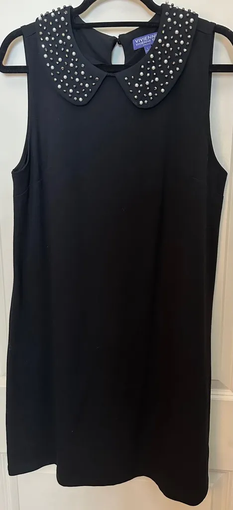 Chic black mini dress by Vivienne Tam. Features a sleeveless design and studded collar. Ideal for stylish outings. Good preloved condition, all beads are intact, some markings