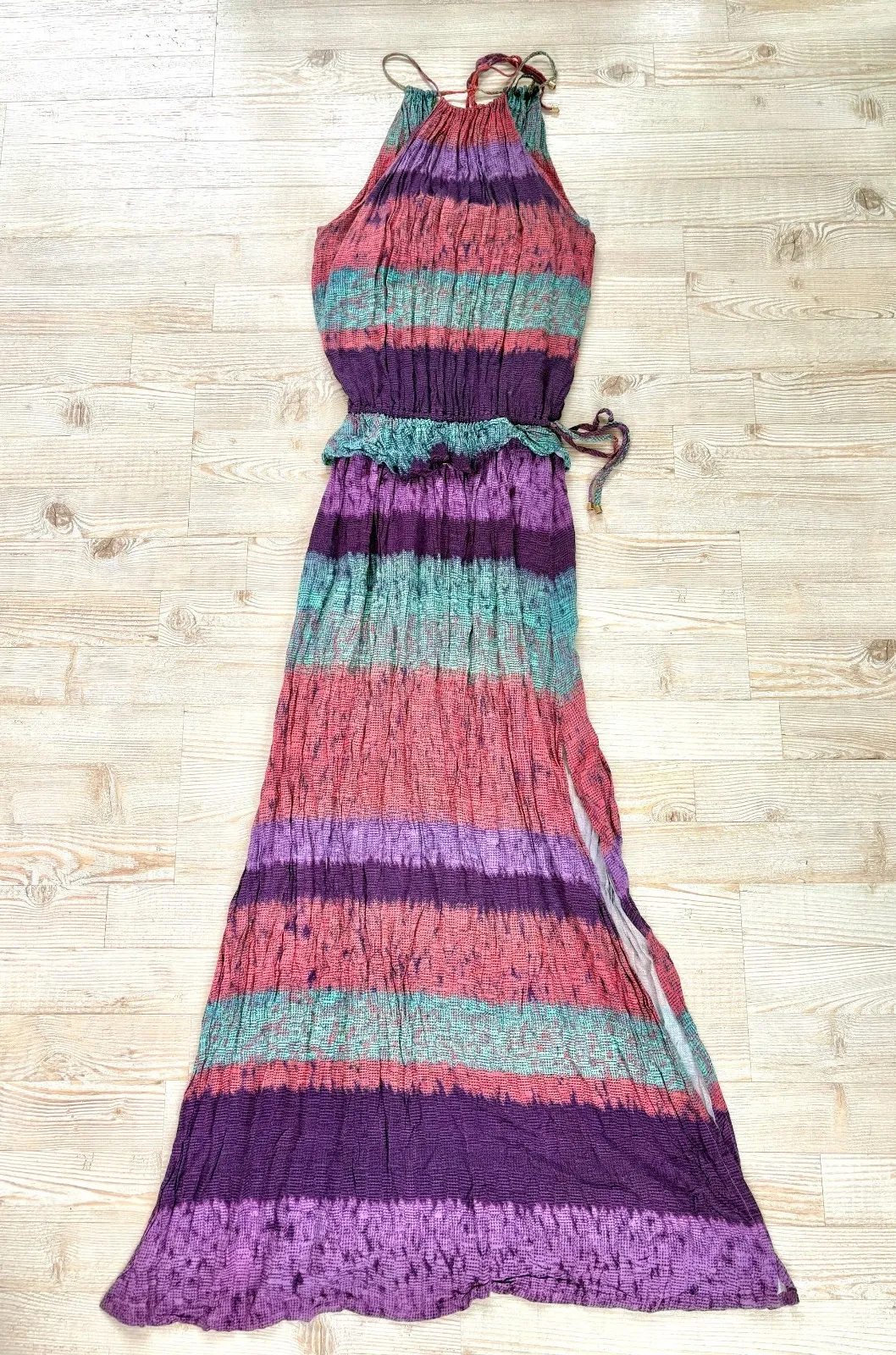 In excellent condition! Named after the beautiful berries that adorn this South American palm, the Acai Ceci Long Dress is patterned with a mystique array of stripes in the perfect palette of color. Dress is long in length and cinched at the waist for a feminine fit. It is designed with a high neckline and keyhole back, making it vastly desirable and effortlessly sexy. Features: * A delicately gathered adjustable tie string neckline with a keyhole opening along the front and the back * An elastic band at the waist * Long slits along the bottom half of both sides * Made with a pure, lightweight Rayon material