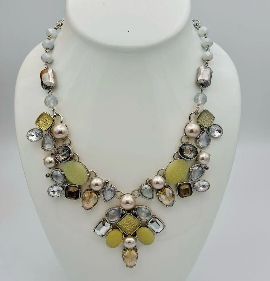 CHICO’S Faux Pearl Crystal Druzy Cluster Silver BIB Statement necklace Adjustable with lobster clas... Show more