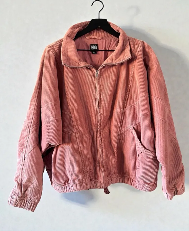 A cozy-cool corduroy jacket in the prettiest muted pink—perfect for layering all fall and winter. This BDG Urban Outfitters zip-up has that relaxed, oversized vibe with a slouchy fit, soft wide-wale corduroy, and easy balloon sleeves. Super comfy and on-trend. Features: • Wide-wale cotton corduroy • Full zip front • Oversized drop-shoulder fit • Stand collar • Two front pockets • Elasticized hem w/ adjustable drawcord • Balloon-style sleeves • 100% cotton body + lining • Color: dusty pink / rose • Size: Small (S/P) Condition: Good pre-owned condition. Light overall wear consistent with corduroy; no major flaws noted. Measurements (flat approx): • Length: 24” Why you’ll love it: Soft, easy to style, and a perfect neutral-pink for cozy season. Great for campus, errands, coffee runs, or gifting someone who loves Urban Outfitters pieces. From a smoke-free home. Ships same/next day! 8-1