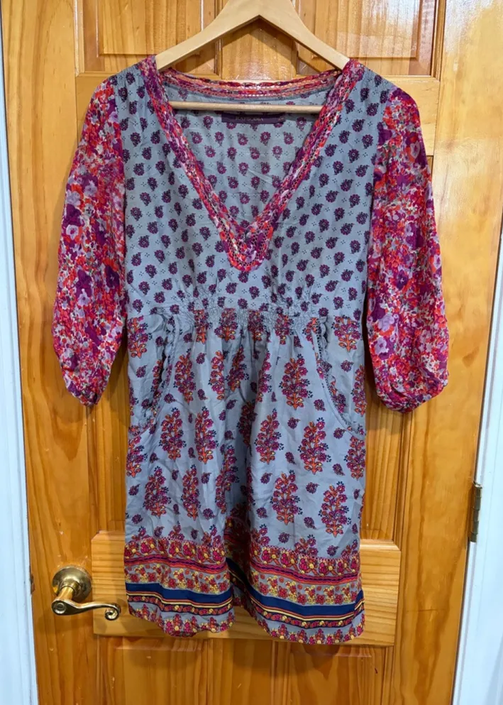 Beautiful Rapsodia boho tunic top featuring a vibrant mix of floral and paisley prints in shades of red, purple, and coral on a soft gray base. Designed with a deep V-neckline trimmed in colorful crochet, 3/4 balloon sleeves, and a lightly elastic waist for shape. Can be worn as a flowy top or mini dress on a petite frame. Details: Brand: Rapsodia Size: S (EU 38/40) Color: Gray with multicolor floral and border prints Style: Boho peasant tunic top / short dress Features: V-neck, 3/4 sleeves, elastic waist, border hem, mixed prints Condition: great preowned condition; some minor wear in crochet neckline