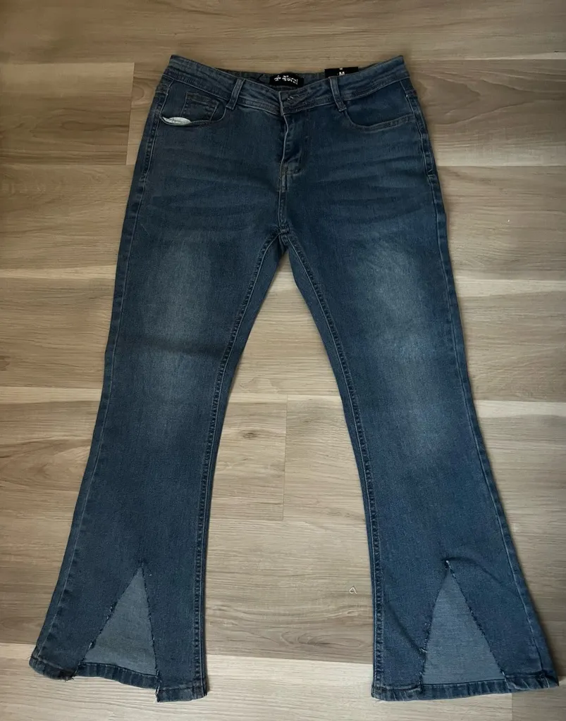 Chic flare leg jeans by Vocal. Classic blue denim with stylish cutouts. Perfect for casual wear. These jeans while new with tag originally had rhinestones chains hanging from the v cut out on the bottom. They have been removed, but a nice pair of jeans. Note: the black x in the waist band too notes the rhinestones have been removed.