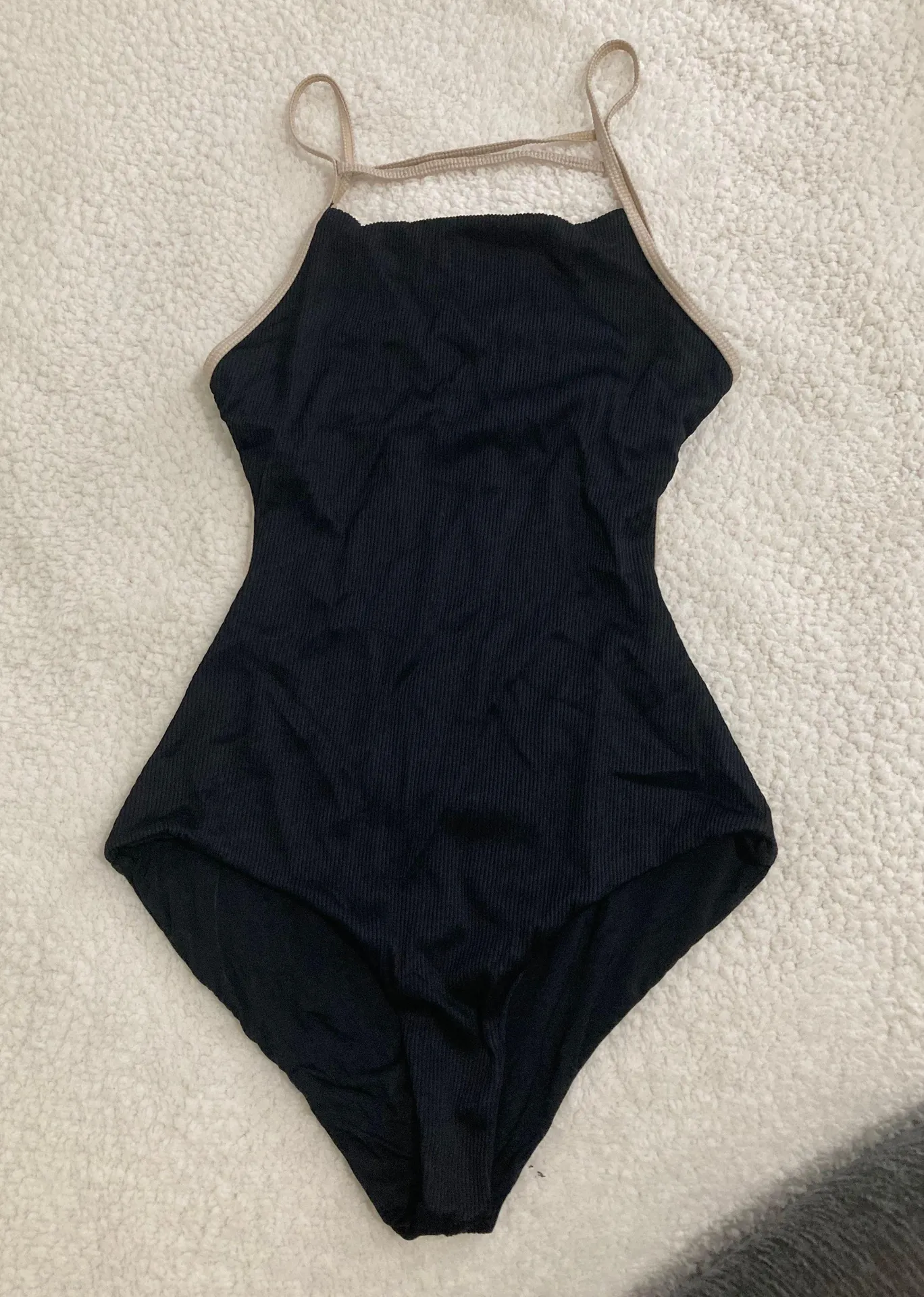 Has no tags but fits small Open back Black ribbed material with tan straps