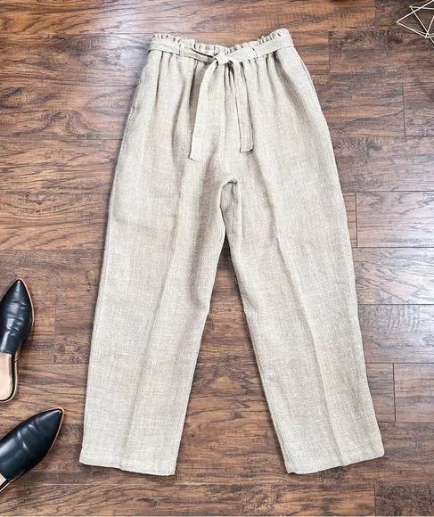 Fabulous vintage 1990s high waisted trousers by Harve Benard by Benard Holzman. Straight leg paperbag waist style in tan burlap material. Partially lined. Attached ties at waist. Waist 28“, hips approx 42”, rise 13“, inseam 27.5“. Size tag is missing but these fit like a modern size S, great vintage condition. All measurements taken with garment lying flat & doubled where applicable.