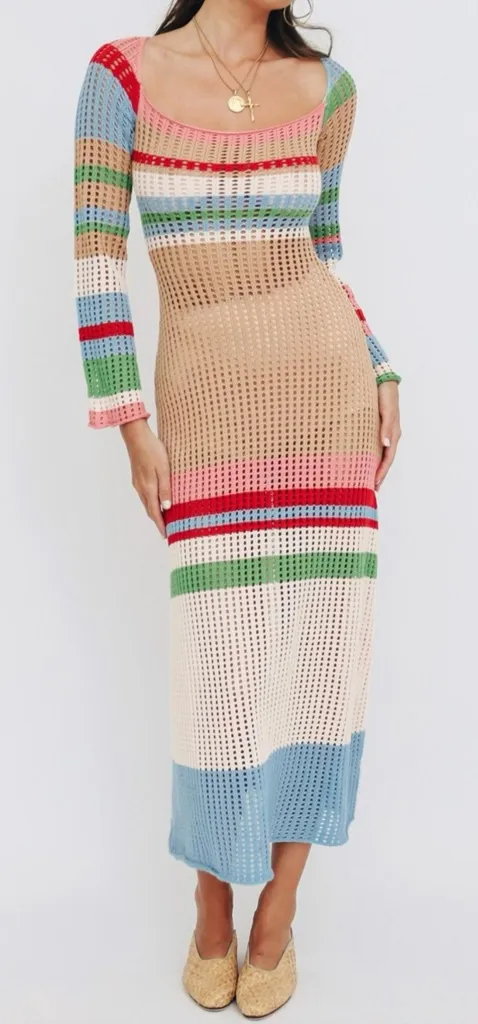 Open knit crochet that is slightly see through New without tags Excellent condition Approximate measurements Bust across 13” Waist across 11” Length 53” Sleeve length 24” Dreaming of sun-kissed skin, salty hair & sunset cocktail hour in the ultimate crochet dress... Please note garments worn underneath are not included. Details A semi-sheer, open weave knit fabric 55% Acrylic / 45% Cotton Cold Hand Wash / Cool Iron