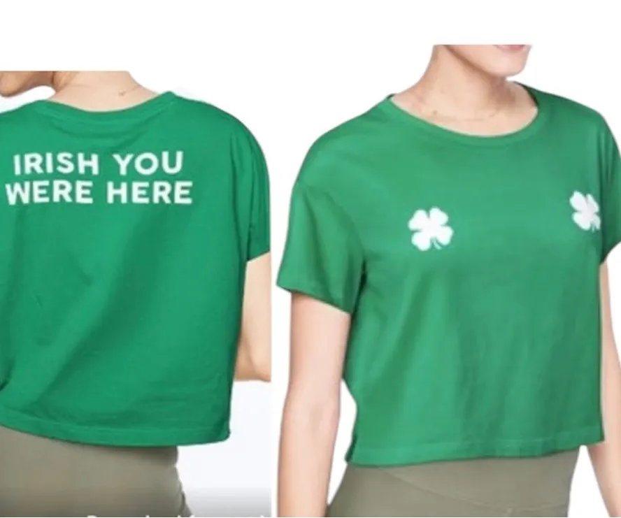 VS Pink Irish you were here shamrock crop top tee XL TS 1952 VS Pink Irish you were here shamrock crop top tee green white graphics XL preowned, wash wear cotton, side vents holiday fun cute four leaf clover march St. Patrick's Day green curves curvy 14 16 extra large novelty celebrate VS Pink Irish you were here shamrock crop top tee XL
