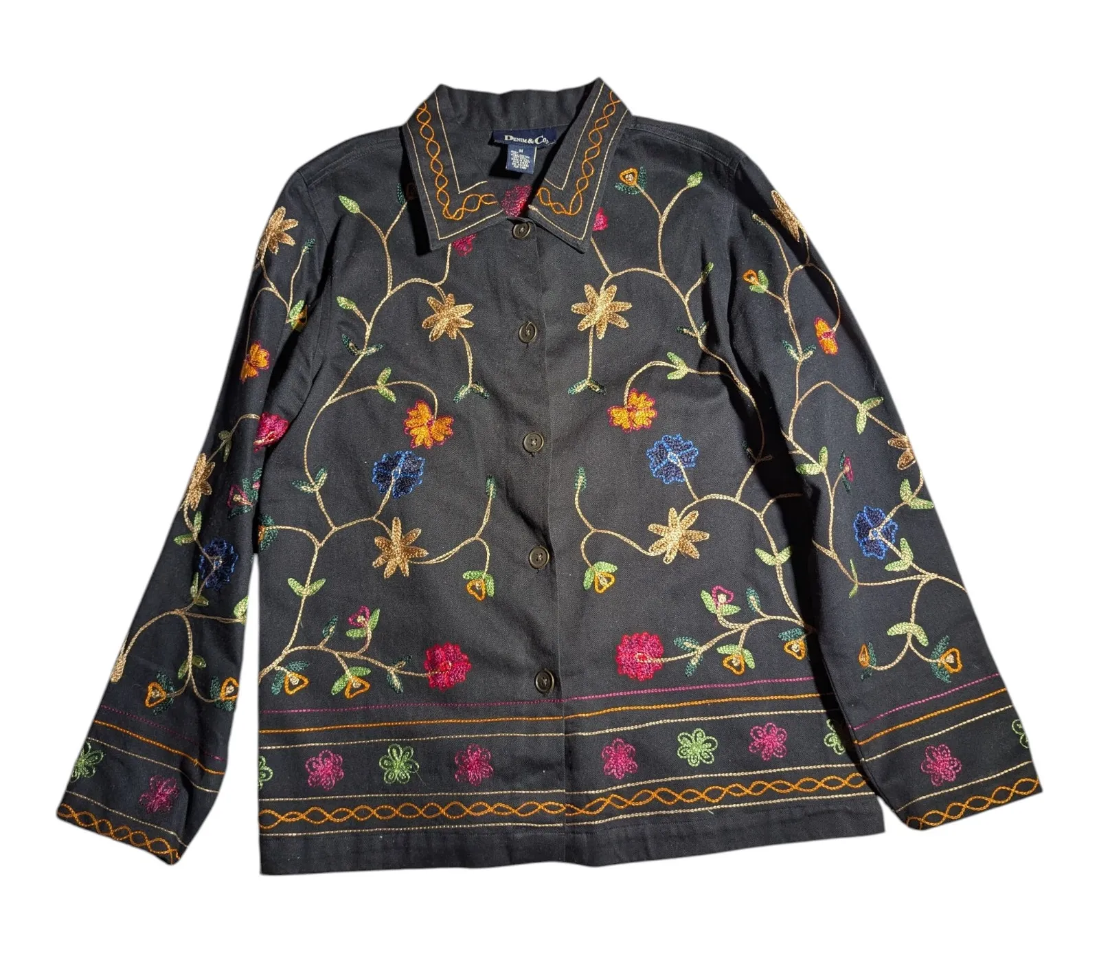 Black 100% cotton collared button up jacket with colorful allover floral embroidery, from Denim & Co. Vintage circa the 1990s. Excellent gently used condition. Bust: 19" flat Length: 25"